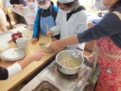 今日は,お味噌汁とごはんを作りました。みんなで,手分けをしながら,おいしく作ろうと頑張りました。食べた後は,最後までが調理実習と,使ったお茶碗やお鍋を洗ったり,ふいたりと片づけをしました。「おうちでもお手伝いをしたいな。」という声もでました。