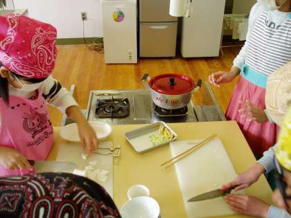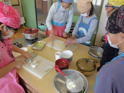 今日は5年2組の子どもたちが,家庭科の調理実習を行いました。具材(ねぎ・大根・油揚げ)を適当な大きさに切り,出汁をとってみそ汁を作りました。