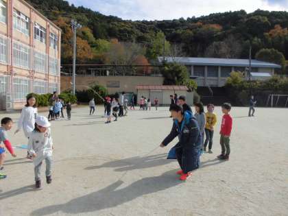 毎年冬になると,たかつかグループ(たてわり活動)で「なわとび大会」が開かれます。個人技では,自分の決めた跳び方で何回飛べるのかを数えます。グループ競技では「八の字」をみんなで何回跳べるのかを数えます。今日は今年になって初めての大なわを使って,中間休みの時間に練習をしました。「八の字」を跳ぶのは初めてという1年生には,回し手の高学年のリーダーが優しく教えたり,ゆっくり回したりしながら,楽しく練習をしました。