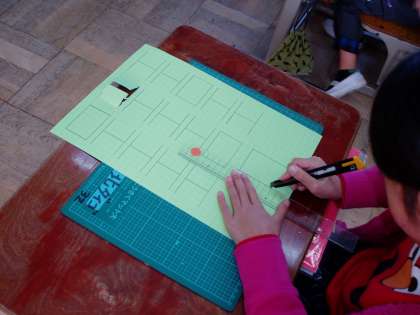 2年生は,図画工作科の時間にカッターナイフを使った作品作りに挑戦しています。カッターナイフの持ち方や使い方は,前の時間に練習を済ませていますが,子どもたちは少し緊張した様子で活動しています。