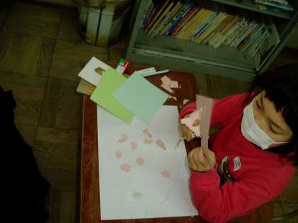 まずは,テーマに沿った下絵を描き,次にボール紙やストロー,毛糸などの材料を下書きに合わせた形にしながら,台紙に張り付けて版を作っていきます。子どもたちは,作品の仕上がりを想像しながら取り組んでいます。