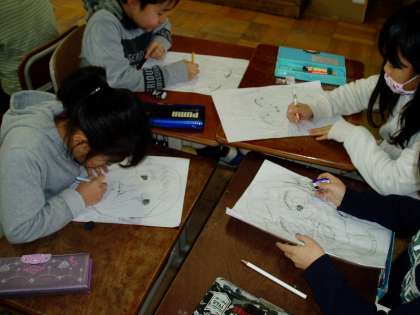 3年生は,図画工作科の学習で『木版画』に挑戦します。今日は版画を制作するための下絵を描いています。