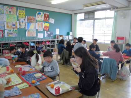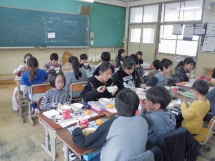 今日は「防災とボランティアの日」です。学校では台風や地震などの緊急時に対応できる食材を保管しています。今日の献立は,それらを使って,カレーピラフとトマトスープ,みかん,牛乳です。たてわりグループでみんな一緒に給食をいただきました。1年生は6年生のお兄さんやお姉さんと一緒に手をつないで,担当グループの教室に向かいます。給食の量などを高学年のお兄さん,お姉さんは考えながら,丁寧に配膳していきます。みんなでいただく給食は楽しい時間です。