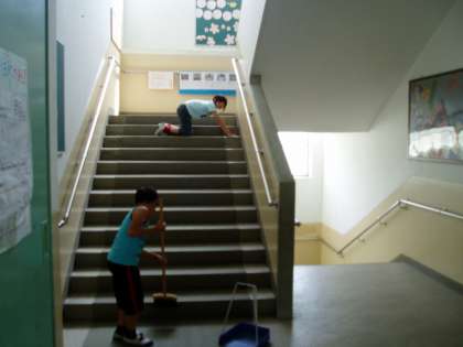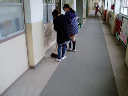 掃除の時間になりました。南校舎2階の廊下と2階から3階へ上がる階段掃除の様子です。廊下は6年生が,階段は4年生が中心になり清掃活動に取り組んでいます。