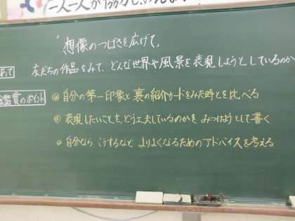 4月に取り組んでいた絵画の鑑賞を学年全体で行いました。「想像のつばさを広げて」という題材でこんなことがあったら楽しいかったり不思議だったりする風景や世界を表現しました。それぞれのクラスで友だちの作品の工夫や思いを想像してみていました。