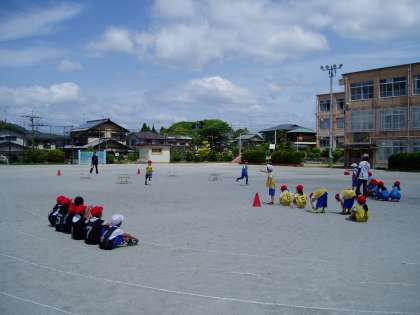 朝からの晴天で水たまりが無くなった運動場では,1年生の子どもたちが体育の学習で置き換えリレーを楽しんでいました。