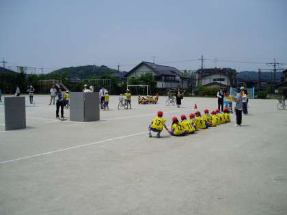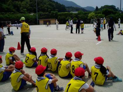 少し蒸し暑い中,警察署や地域の皆様,保護者の方々にご支援をいただきながら自転車の正しい乗り方を教えていただきました。