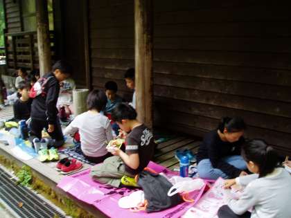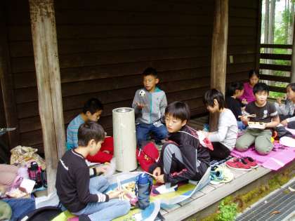 入所式を終え,バンガローの前庭でお弁当をいただきました。