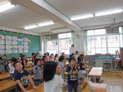英語の時間は,斉藤先生に来ていただき歌を歌ったりジェスチャーゲームをしたりと楽しく学習することができました。英語の絵本「おさるのジョージ」の読み聞かせもしていただきました。