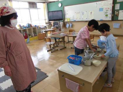 今日の給食は,チキンカツ,野菜のソテー,なめこの味噌汁でした。一口サイズのカツを一人4個ずつ配った後,「おかわりもあるね。」と,話しながらうれしそうにいただいていました。