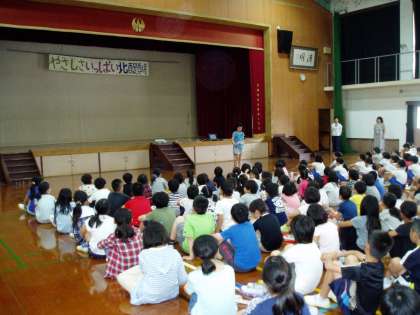 最初に育成学級の担任から,育成学級(あすなろ学級)の説明や育成学級で学ぶ仲間の紹介がありました。次に,全校合唱で『やさしさ いっぱい 北醍醐』を歌いました。
