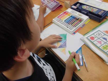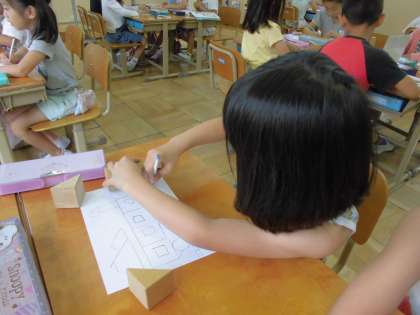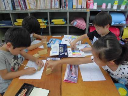 1年生は算数科の学習で「いろいろなかたち」の学習をしています。今日は,つみきなどの形を写し取って,何かに見立てて絵を仕上げました。「山」「電車」「ロケット」「動物」・・・など,発想豊かに楽しみながら学習することができました。