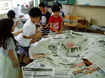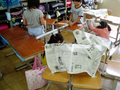 2年生は図画工作科の時間に,新聞を使ってダイナミックな活動をしていました。新聞紙の特性を活かしながら,グループごとにみんなの家を作っています。