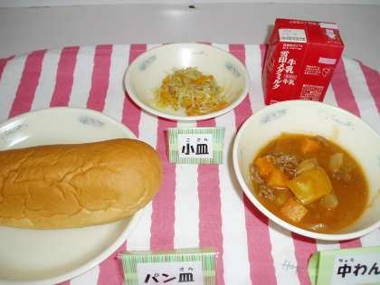 今日の給食は,『トマトシチュー』と『もやしのカレーソティー』です。