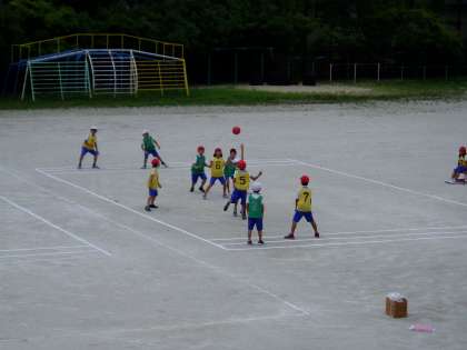 3年生は,体育科の学習で『エンド・ボール』に挑戦しています。チームで協力しながらパスをつなぎ,味方のゴールマンにボールが渡れば得点になります。子どもたちは,低学年で練習していたパスゲームを思い出しながら,活動を楽しんでいました。