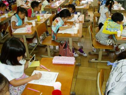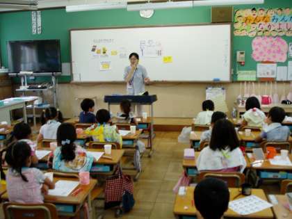 1年生は,上手な歯磨きの仕方を養護教諭と一緒に学習しました。プラークテスターを使い,汚れが残りやすい場所を見つけました。手鏡で自分の歯を見ながら,歯と歯の間や歯と歯茎の境目に汚れが残ることに気づいていました。