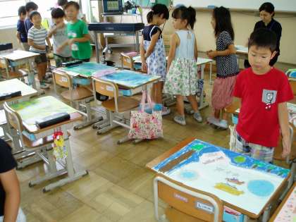 2年生の子どもたちは,図画工作科の学習で友だちの作品を鑑賞し合いました。鑑賞後には,友だちの作品を鑑賞して気に入ったところや工夫に気づいたことを書き出しました。どの作品も,子どもたちの個性が光るものばかりです。