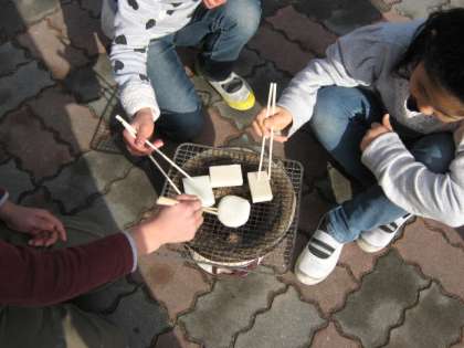子ども達は、やわらかくなったおもちにしょうゆをかけて、