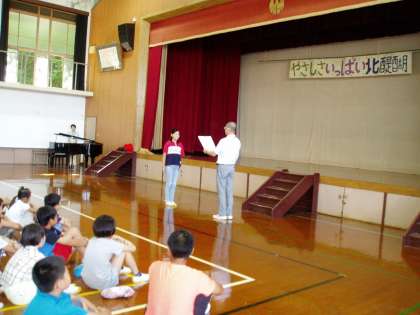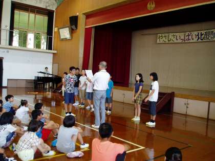 始業式の後,夏休み期間中に実施された全市大会で健闘し,立派な成績を修めた子どもたちの表彰を行いました。