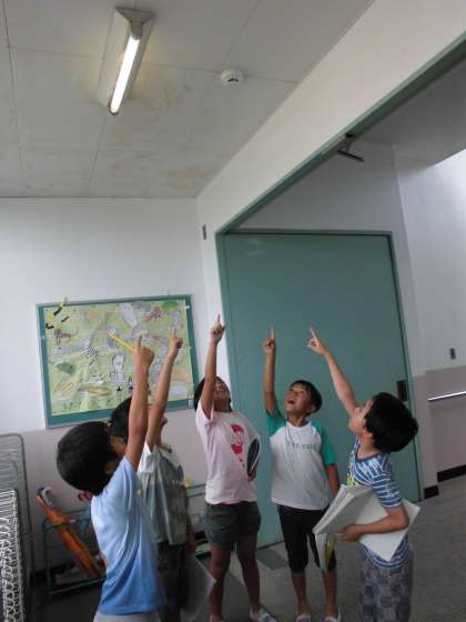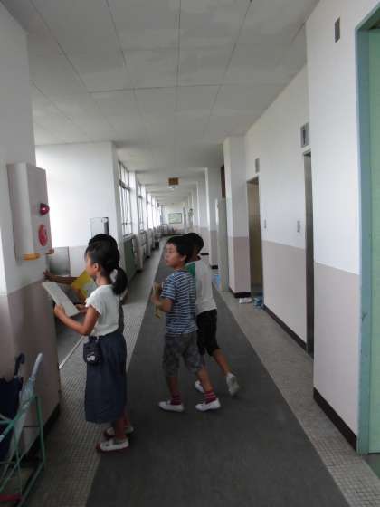 社会科の「安全なくらしをまもる」の学習で,学校の中に防災のための機器がどのくらいあるのかを探しに,校内を探検しました。防火バケツ,非常ベル,防火ホースなど,たくさん見つかりました。