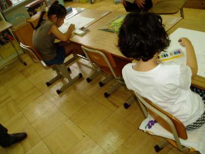 今日は『チャールズ・ダーウィン、世界をめぐる』という絵本を題材にお話の絵に挑戦中です。それぞれが,気に入った場面を絵にしています。