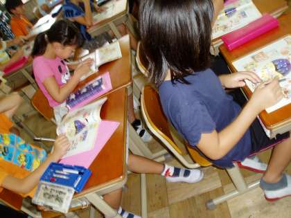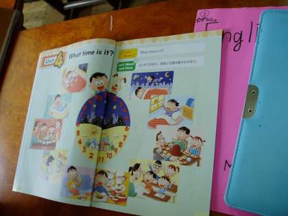 今日は,時刻の尋ね方やその時々に,どんなこと(日課)をしているのかを結び付けながら英語に親しみました。