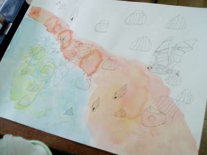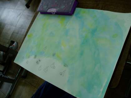 前回までに背景を絵の具で色付けしたり,登場する生き物などを描きました。今日は人物を描き加えていきますが,その前に友だち同士が顔を見合わせて表情を観察し合いました。