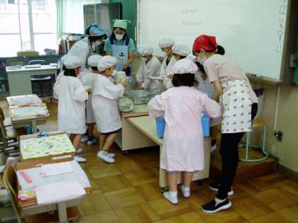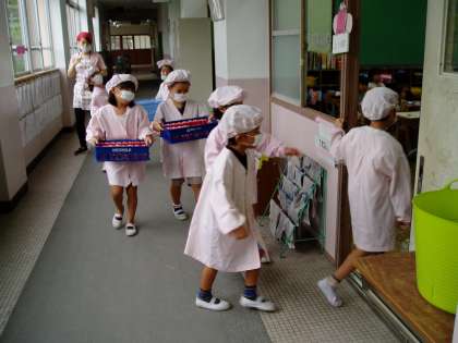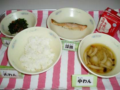 今日の給食は,『ごはん』『牛乳』『さけの塩こうじ焼き』『ほうれん草のおかか煮』『いものこ汁』というメニューです。