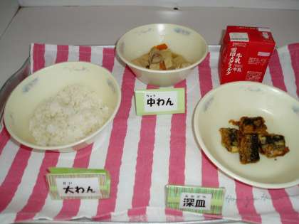 今日の給食のメニューは,『胚芽米ごはん』『牛乳』『いわしのかばやき風』『高野豆腐と野菜のたき合わせ』でした。甘辛いたれの『いわしのかばやき風』は,ご飯によく合う一品です。