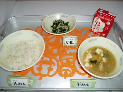 今日の給食メニューは,『麦ごはん』『牛乳』『五目どうふ』『ほうれん草ともやしの炒めナムル』でした。
