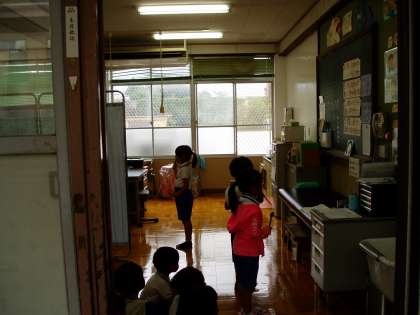 写真は,1年生の検査と検査後に教室で待っている様子です。1年生は検査が終わり全員がそろうまで,本を読むなど自分で学習できていました。