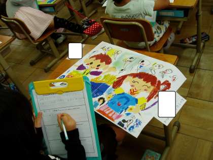 今日は,自分が描いたお話の絵の中で,頑張ったところや工夫したことをカードに記した後,友だちの絵を見ての感想も記してみました。子どもたちは,友だちの絵の素敵なところや頑張っているところを沢山見つけていました。