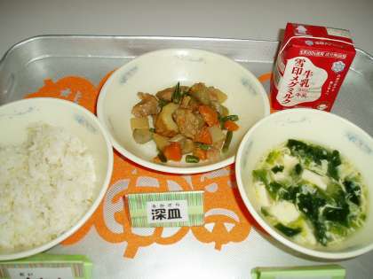 今日の給食は,『麦ごはん』『牛乳』『筑前煮』『かきたま汁』でした。