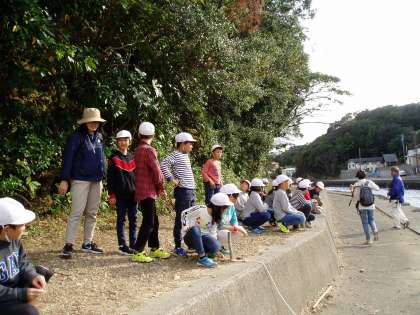 バンガローで布団の準備を終え,次は「かご漁体験」です。グループごとに,入って欲しい魚の名前を呼びながら,かごを海に投げ込みました。