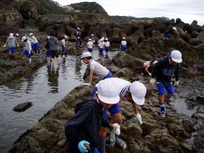 曇りがちですが風はありません。水は少しだけ冷たく感じますが,子どもたちからは,そのような声は聞こえてこず,興味をもって生き物探しに熱中しています。