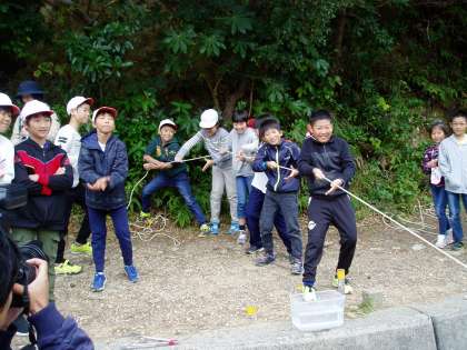 子どもたちは,捕まえたい獲物の名前を呼びながらロープを引いています。他のグループも応援してくれています。