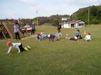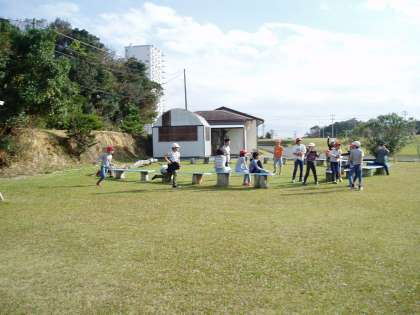浦山ラリーを終えて芝生広場に戻ってきました。リンゴジュースを飲んで休憩し,自由遊びが始まりました。芝生の上で,思いっきり体を動かして遊びました。