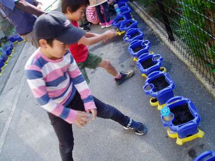 2年生は生活科の学習で,ラディシュ(はつか大根)を育てます。今日は,植木鉢にラディシュの種まきをしました。