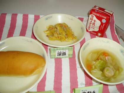 今日の給食メニューは『ミルクコッペパン』『牛乳』『ペンネの豆乳グラタン』『ソーセージと野菜のスープ煮』でした。