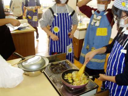今日の調理実習は,『野菜の炒め物づくり』です。グループで協力しながら,決められた時間内に後片付けまでが終われるよう取り組んでいました。