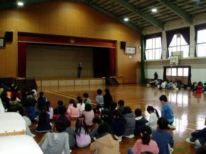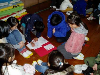 たてわりグループごとに集合し,2月5日に行う『なわとび大会』への個人出場種目を話し合って分担しました。高学年が話し合いを進め,低学年から順番に希望を聞きながら役割を決めていました。