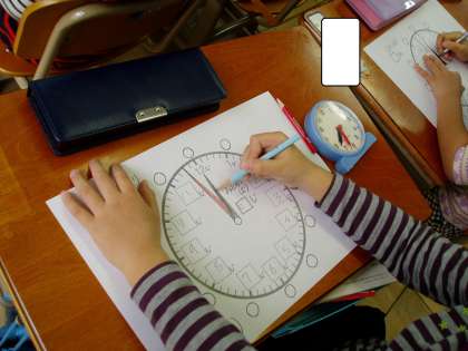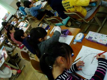 1年生は『とけい』の学習です。子どもたちにとって『とけい』は,とっても難しい学習の一つです。学校生活の中でアナログ時計を使いながら,学習と結びつけ読み方や表し方を身につけていきます。