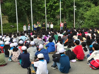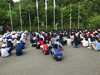 シーツとシュラフを片付けて、参加している5つの小学校の5年生みんなで朝の集いを行いました。北醍醐小学校の様子や魅力を、他校の人たちに伝えることができました。