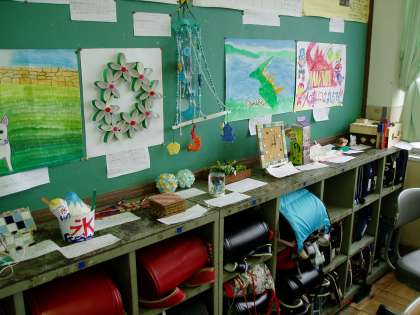 学校の廊下や階段の掲示板,教室の後方には,子どもたちが夏休み中に制作した工作や自由研究が展示されています。
