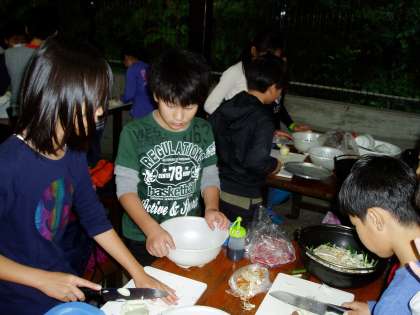 夕食の準備に取り掛かっています。みんなで協力して,美味しい晩御飯を作ります。