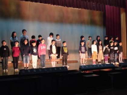 学習発表会に向けて舞台照明なども整い,練習にも力が入ってきました。写真は3年生の子どもたちが,群読の発表練習をしているところです。