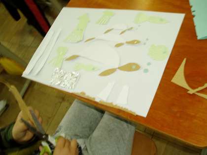 3年生は,紙版画で表現したい『生き物』の下描きを終え,今日は『生き物』の輪郭や部分をその特徴に合わせた素材を選んで紙版画の版を制作しています。