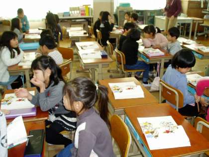 今日はグループごとに,どんなお店屋さんをするのかを話し合っています。お店屋さんが決まると,どんな品物をお店で売るのかをきめるため,品物の名前を集めます。