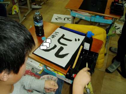 子どもたちは,毛筆で元気よく『ビル』と書きました。