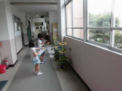 ツルがグングン伸び,葉が大きく成長している様子を絵や言葉で記録しました。お天気が良くなかったので,『あさがお』を廊下に持ち込んで観察しました。